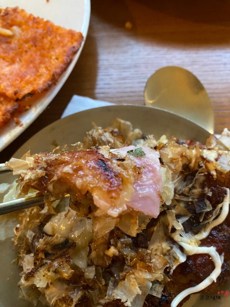 조금은 다르게 해석한? 보통 오코노미야키는 재료가 엄청 많이 들어가는 게 아니고 주된 내용물이 있는데... 이 오코노미야키에는 베이컨과 해물 믹스? 이런 게 들어가 있더라고요. 딱 안주 메뉴라고 생각하시면 좋을 것 같아요. 짭짤하니 좀 자극적이더라고요. ㅎㅎ