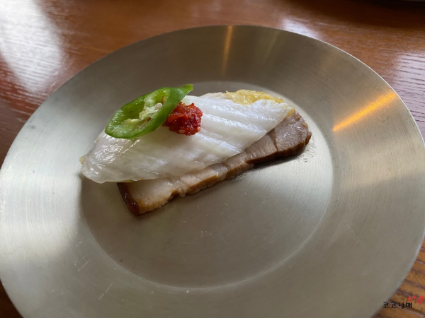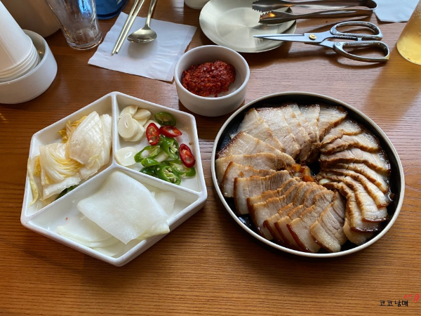 먼저 나온 것은 천년초 수육. 수육이 얇게 썰려 있어 먹기 아주 편했습니다. 남편이 진짜 개코인데... (저 멀리 떨어진 팀이 탕비실에서 먹고 있는 피자 냄새도 맡을 정도) 수육에서 잡내가 나지 않는다고 했습니다.