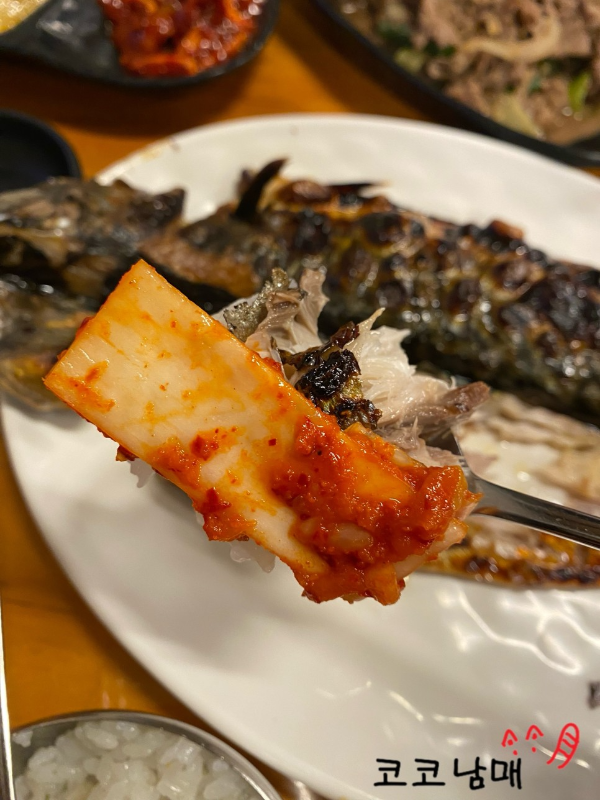 계속 생선구이를 먹기 느끼하다 싶을 때는 김치와 같이 한입하는 것도 좋을 것 같다. 김치의 아삭함과 적당한 빨간 고춧가루 양념이 생선구이와 잘 어울린다.