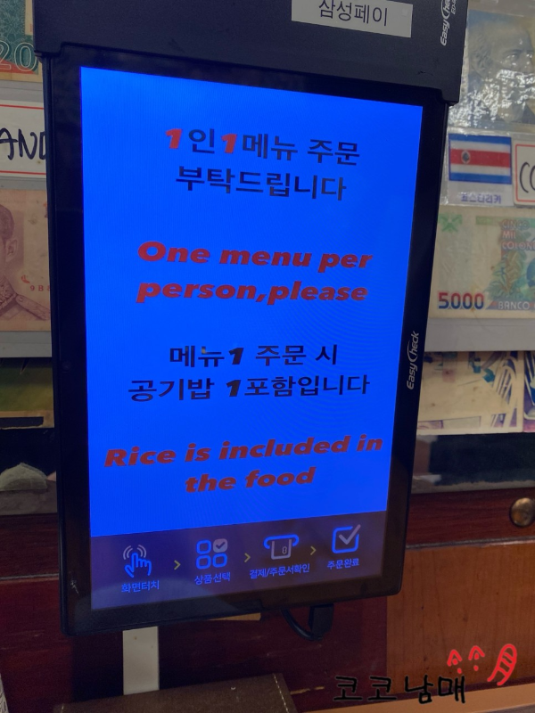 1인 1메뉴 주문이며, 메뉴마다 공기밥이 나온다. 국물이 없는 메뉴에는 미역국이 제공된다.