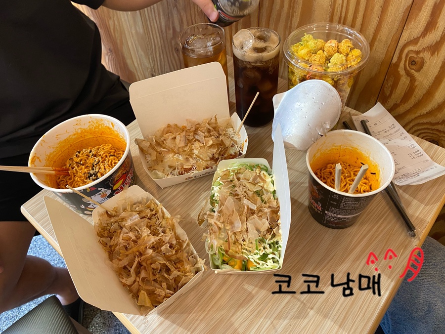대망의 먹방 시간. 불닭볶음면은 물을 버려주시고 주십니다. 오랜만에 불닭이었는데 맵지 않을까 걱정했지만, 타코야끼와 아주 궁합이 좋았습니다.