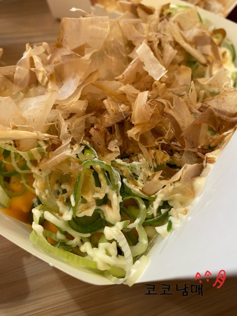 두 번째는 네기타코야끼. 파가 진짜 듬뿍. 가쓰오부시도 듬뿍. 파가 아삭아삭하고, 자칫 체다치즈가 느끼할 수 있는데 이를 잡아줬습니다.