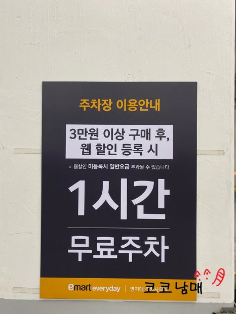 상점가에 있는 이마트에브리데이에서 3만 원 이상 구매 후 웹 할인 등록이 완료되면 1시간 무료주차가 가능하다고 합니다.